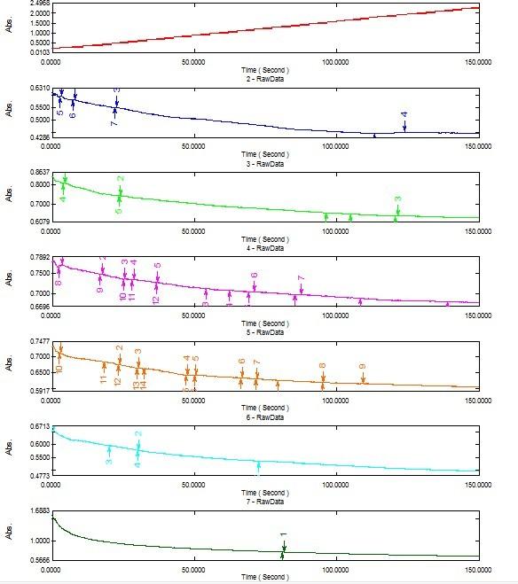 我想请教一下各位大侠,下面是我测定的漆酶酶活 我是选的紫外分光光度计,测定的漆酶反应ABts,根据吸光度的变化来测定酶活,但是我不太明白除了第一个原酶液的曲线是上升的趋势外其他的都是呈下降趋势。求各位帮忙解答一下。 还有就是我怎么根据斜率来测定漆酶的酶活啊。。。 漆酶酶活.jpg |