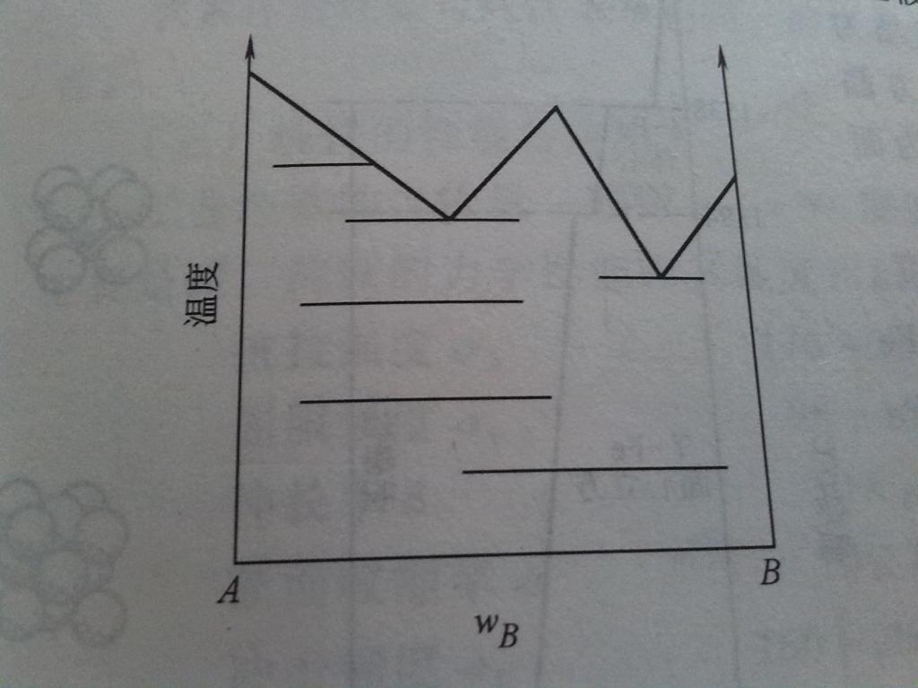 有实验获得A-B二元系的液相线和各等温反应式的成分范围,如下图所示。在不违背相律的条件下,试将此相图绘完,并填写其中各相区的名称(自己假设名称),写出各等温反应式。 IMG_20130512_122024.jpg |