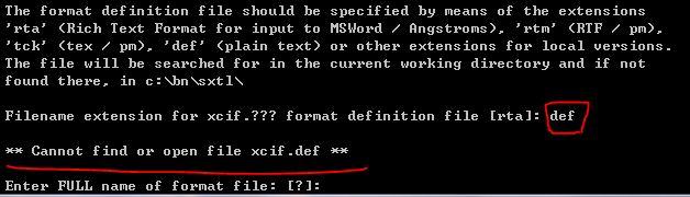 安装新版shelx2013后,将ciftab更名为xcif替换掉老版的xcif程序,但在运行新版xcif生成tex文件时会出现如下提示,无法继续下去;查看安装目录(C:\SAXI\SXTL)是存在xcif.def的,为何还会提示不存在呐?期待高人解决!!! 捕获.JPG [ Last edited by wfgd on 2013-5-12 at 19:02 ] |