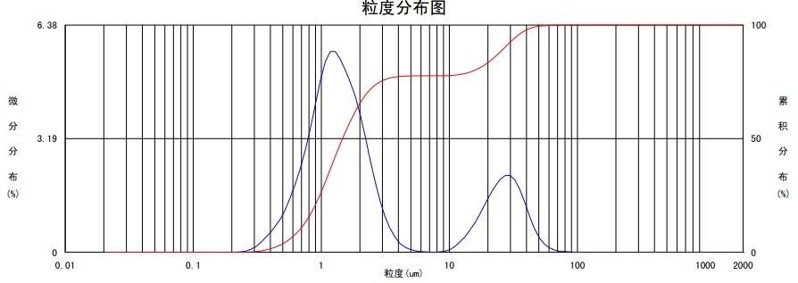 这种情况应该是颗粒有聚集,有些做球的,是小颗粒聚集成大颗粒,然后由于形貌不均一,就出现两极结构。从你的粒度分布看,初级颗粒的1.2微米左右聚集颗粒在30微米左右,还是蛮大的