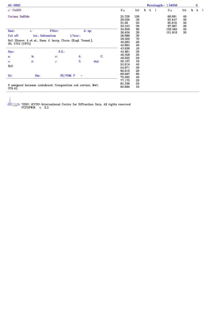 请问谁有Ce2S3的XRD图啊,帮忙找一下,谢谢