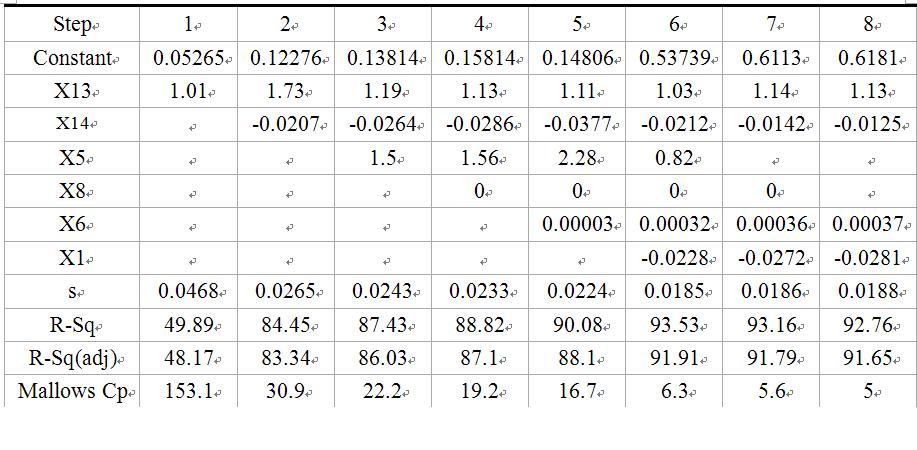 请教: 本人对附件所示数据进行Stepwise 回归分析,结果如下:请问X8在每个模型的系数均为0,如何解释?若为0,为何引入呢?这是不是跟minitab的有效数字设置有关?如有关,应在哪里设置呢? 请教各位! 计算结果 如图片所示 未命名.jpg |