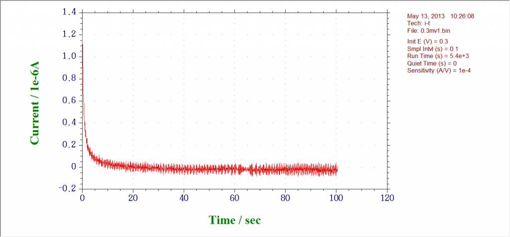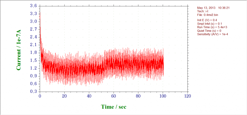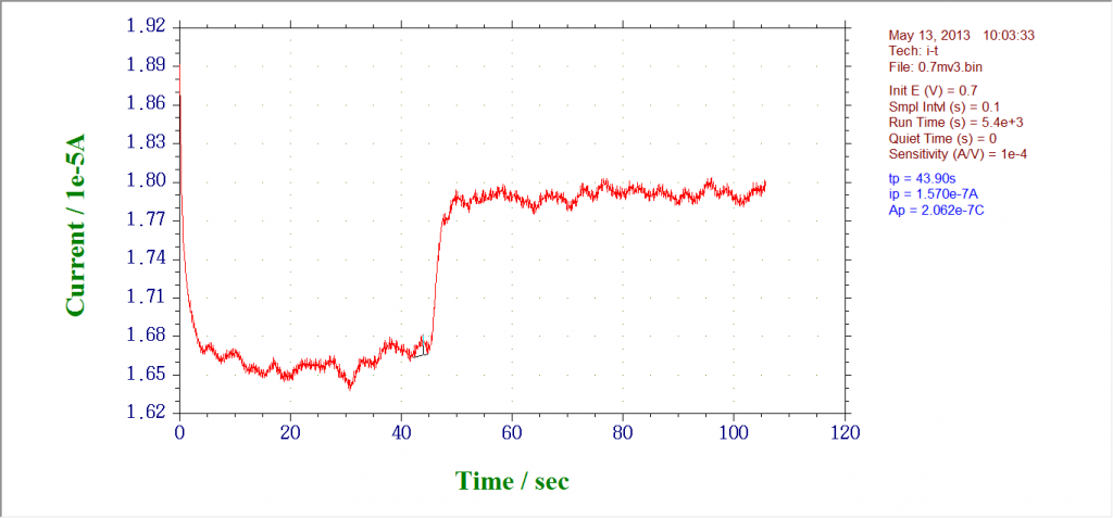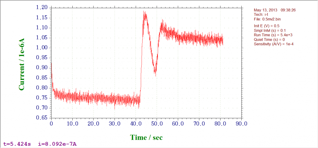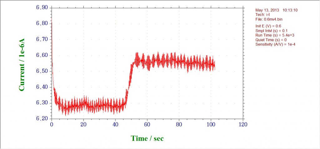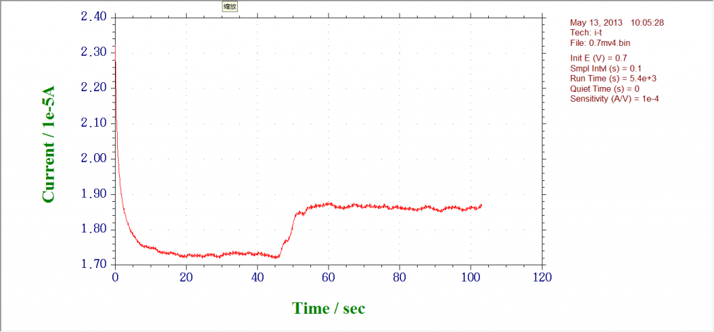 过氧化氢传感器,石墨烯的复合材料,滴加了辣根过氧化酶。在每次在电极附近滴加0.5mM的H2O2在PBS中,搅拌(转速已经调到最低)条件下,做电位的考察。求助大神,为何是这种情况?如何解决?附上在0.7V、0.6V、0.5V、0.4V、0.3V条件下的图 0.71.png 0.7.png 0.6.png 0.5.png 0.4.png 0.3.png |