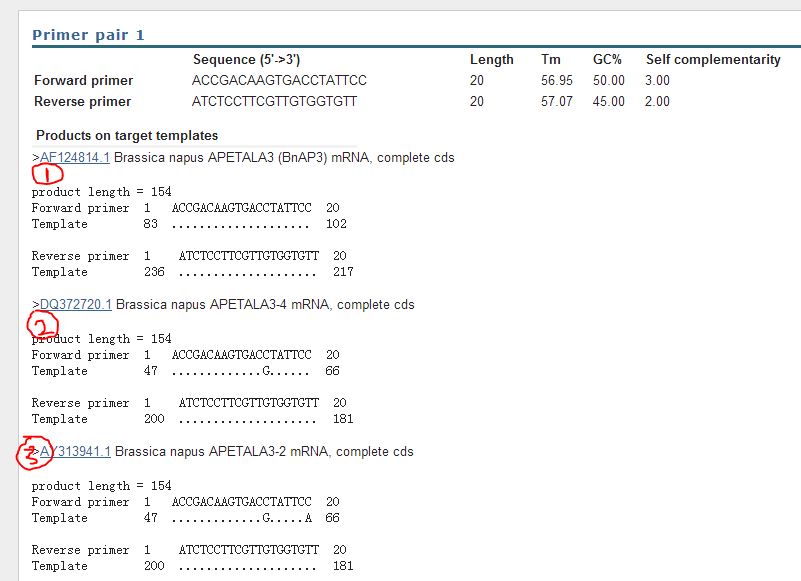 小弟最近要做荧光定量,设计了几对引物,为了验证引物的特异性,用primer-blast检测,结果如图所示,第一个为我设计用的基因序列,后面两个说明什么,是不是特异性不好?这几个基因使一个基因家族的。