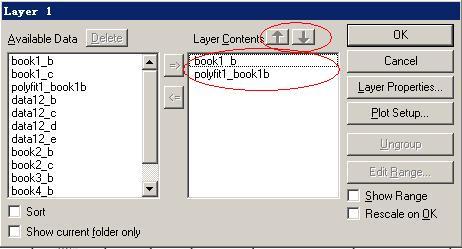 以Origin8为例,右键点击图片左上角的图层标识,选择Layer Contents,这样出现下面的窗口。在右面的数据列里面,选择1所在的数据文件,然后按上面的上箭头,将它挪动到2所在数据文件的上方,然后点击OK就行了。
