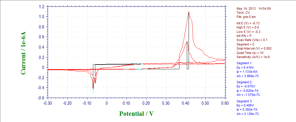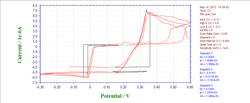 这两张图是已石墨烯为工作电极测得CV 图,实验条件:50mv/s, PBS缓冲液;请各位大神予以分析指点。