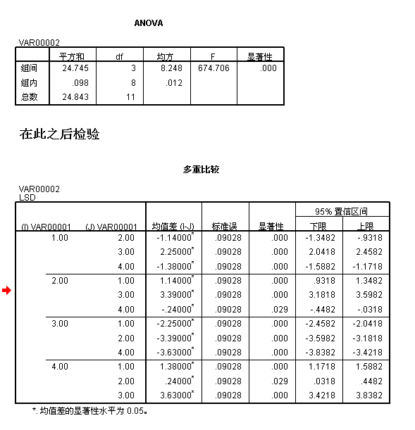 我做的是单因素方差分析,初步判断2和4是显著差异,而其他的都是极显著差异,但是不太懂置信区间~~~