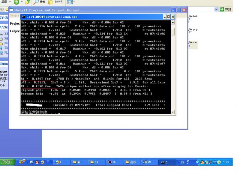 本人解单晶是一菜鸟,最近在试着解一单晶,R都降到0.14以下了(见附图2),可就是离原料预想的结构相差甚远,怎么弄都在N上还缺一个带Br的6元环结构(见附图1)。 请可以帮助我的高手留下邮箱,我好把原始数据发给您帮我看看,是空间群错了,还是信噪比太低,其值为3.56,该单晶易风化,是封管测试的。 图1.JPG 图2.JPG |