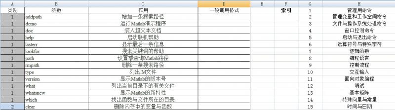按作用对matlab的命令进行分类整理,并且具有索引,excel版,ctrl+F就可以方便的找到你想要的功能,然后具体算法在百度里或者在命令行里doc 函数名就可以了。 (N~XJO[2_G9$MXGTB9PLVID.jpg |