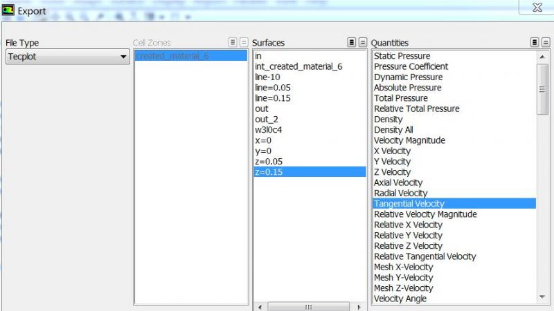 在fluent里计算后在z=0.15平面上,切向速度沿这个平面上的一条直线的分布(简称xy图)。还要进行一些修改。 求高手们指点下,这图怎样才能导到tecploct里面去。(我以cas和dat形式导入tecplot结果只有个三维几何模型,不知怎么调出在fluent里画好的xy图,或者跟不能就不是那样导入到tecplot里面去) 再次谢谢了 谢谢.JPG |