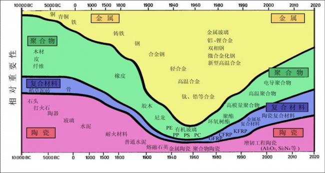图中显示,1960年代,整个材料(包括金属、聚合物、复合材料、陶瓷)都处在重要性的低谷,而当时正值美苏太空竞赛,这些材料应该处在蓬勃发展阶段,重要性应该都很高。