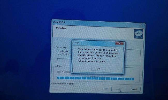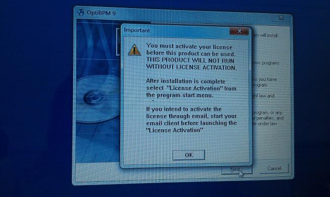 安装过程中出现附件提示的错误,安装完成后,将LicenseActivation的两个文件拷贝到安装目录下。打开optiBPM designer之后,出现License not available.有没有知道怎么回事呀?安装好几遍都不行呀。万分感谢