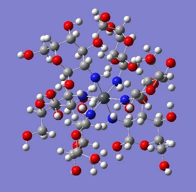 Pb是主族元素,d轨道充满了电子,所以应存在4配位、6配位两种可能(需仔细查一下文献资料核实);配位原子可能全是N、或全是O、或两者兼有,还可能就是同一分子中相邻的两个O或N、O去配位;总之,配合物的结构有非常多的可能性需要去做优化试探。 你给的配合物不是螯合物,因为配体全是单齿的,只有一个配体上有2个或2个以上的原子与中心离子配位时才是螯合物。还有,你的结构优化过了吗?看上去怎么那么拥挤? 最好草拟出多种可能的结构分别进行结构优化,然后计算光谱去对比,基本思路就是如此,只是工作非常繁重,要有耐心。除Pb外,其它原子的计算基组可试探换为6-31++G**。你现在的机器计算没问题,只是比较耗时。好运! |