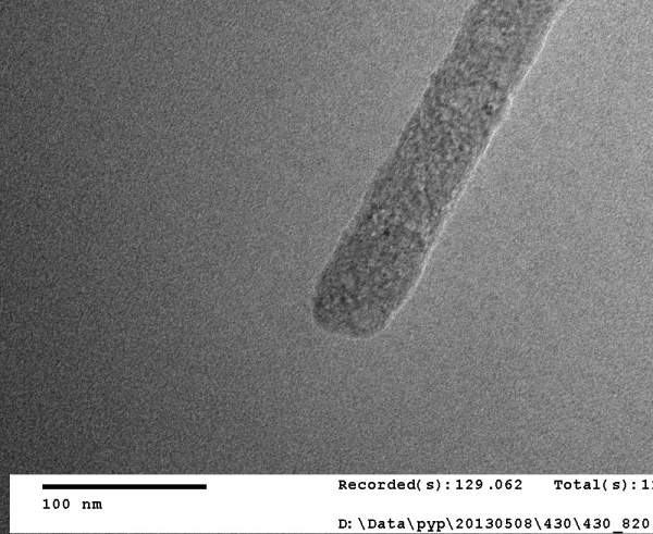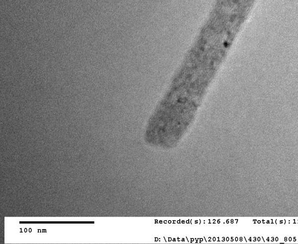 上面的那张是欠焦状态,下面的是过焦状态,过焦的效果就是和欠焦相反,欠焦是白边,过焦是黑边,你可以观察纳米棒的边缘,就能判断聚焦状态。一般在拍电镜时是采用略微欠焦的状态拍摄,电子显微学有个最佳欠焦量就是跟这个有关。 至于那个“黑洞”,我觉得过焦导致的欠焦状态下展现的孔洞边缘变黑是主要原因之一。当然也不排除那个黑点位置是因为有晶体结构存在导致了衍射衬度不同。但这些最好在HRTEM观察后才能最后判断。 |