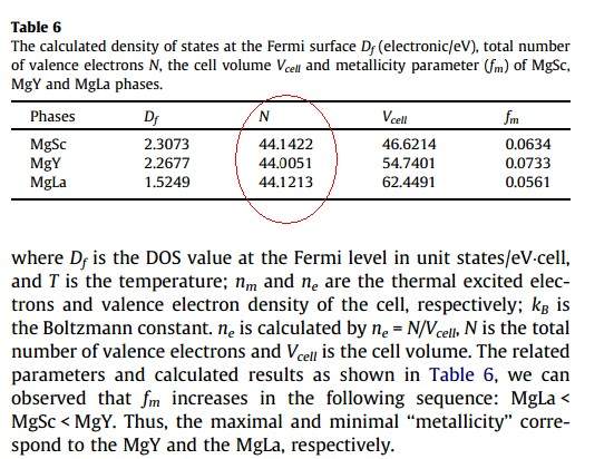 where Df is the DOS value at the Fermi level in unit states/eV·cell, and T is the temperature; nm and ne are the thermal excited electrons and valence electron density of the cell, respectively; kB is the Boltzmann constant. ne is calculated by ne = N/Vcell, N is the total number of valence electrons and Vcell is the cell volume. The related parameters and calculated results as shown in Table 6, we can observed that fm increases in the following sequence: MgLa < MgSc < MgY. Thus, the maximal and minimal “metallicity” correspond to the MgY and the MgLa, respectively