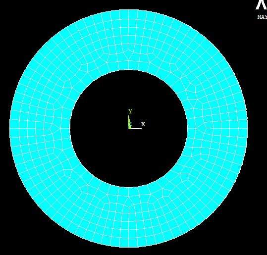 后面是我附的APDL代码:创建这个模型用的。 /PREP7 !画轮子外圆 FLST,2,2,8 FITEM,2,0,0,0 FITEM,2,R1,0,0 CIRCLE,P51X, , , ,360, , !画轮子内圆 FLST,2,2,8 FITEM,2,0,0,0 FITEM,2,62,0,0 CIRCLE,P51X, , , ,360, , !选择内外圆,创建轮子平面 FLST,2,8,4 FITEM,2,2 FITEM,2,6 FITEM,2,7 FITEM,2,5 FITEM,2,3 FITEM,2,1 FITEM,2,8 FITEM,2,4 AL,P51X !显示面积 aplot !定义轨道和车轮的单元 ET,1,PLANE13 KEYOPT,1,1,4 KEYOPT,1,2,0 KEYOPT,1,3,0 KEYOPT,1,4,0 KEYOPT,1,5,0 !定义材料属性,其中有ET、DENS、KXX、C、PRXY MPTEMP,,,,,,,, MPTEMP,1,0 MPDATA,EX,1,,207000 MPDATA,PRXY,1,,0.3 MPTEMP,,,,,,,, MPTEMP,1,0 MPDATA,DENS,1,,0.779e-5 MPTEMP,,,,,,,, MPTEMP,1,0 MPDATA,C,1,,470000 MPTEMP,,,,,,,, MPTEMP,1,0 MPDATA,KXX,1,,4.1e-2 !划分车轮的网格 FLST,2,1,5,ORDE,1 FITEM,2,1 AESIZE,P51X,5, MSHAPE,0,2D MSHKEY,0 CM,_Y,AREA ASEL, , , , 1 CM,_Y1,AREA CHKMSH,'AREA' CMSEL,S,_Y AMESH,_Y1 CMDELE,_Y CMDELE,_Y1 CMDELE,_Y2 !显示单元格子 eplot |