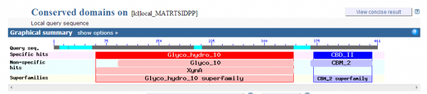 谁能帮我看下这个图,为什么Glyco_hydro_10那一段是断开的。 如果是一个完整的aa序列应该是连续的吗? 我输入了一段aa序列,结果出来这么个图,谁能告诉我能在上边看出什么呀。不懂生物信息学分析。 1.png |