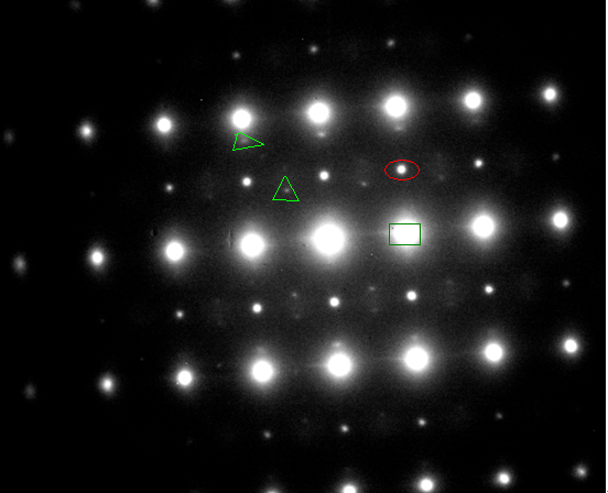 小白求助各位大神,衍射花样标定,如下图,已知的确定的是两种相,正方形框住的为基体相,椭圆里的为析出相,基体和析出相都为面心立方,请教:三角形里的斑点是怎么来的? 查阅资料有人说可能是GP区或者二次衍射斑点。谢谢! TM截图20130528151546.png |
