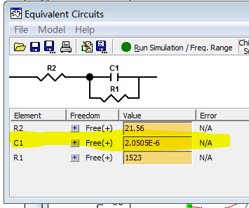 今天用ZView软件对自己做的交流阻抗谱进行了数据拟合,但得到的数据里面的电容却不是我们一般意义上的μF/cm2,具体的形式我也看不懂,显示的是 2.0505E-6N/A 。图片在附件里,求大神指点啊,怎么换算成一般的μF/cm2这种形式 ![]() ![]() 捕获.PNG |