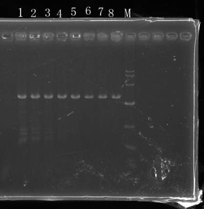 pcr图片,求帮忙分析一下,那个条带最适合做回收用于载体构建,1-4是1min的退火时间,5-8是15s的退火时间