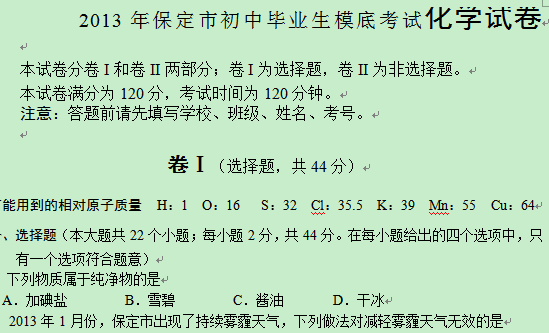 2013年保定市初中毕业生模底考试化学试卷_(1).doc