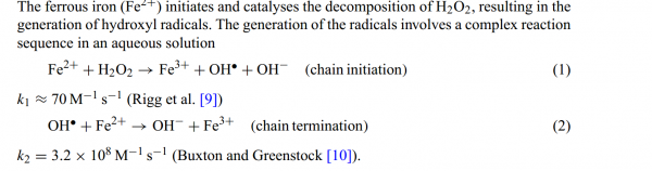 初次接触化学课题,最近看文献,看到fenton里面有关化学式,如图所示,里面K1约等于70M^-1S^-1,K2约等于3.2*10^8 M^-1S^-1是什么意思?谢谢 fenton反应部分过程.png |
