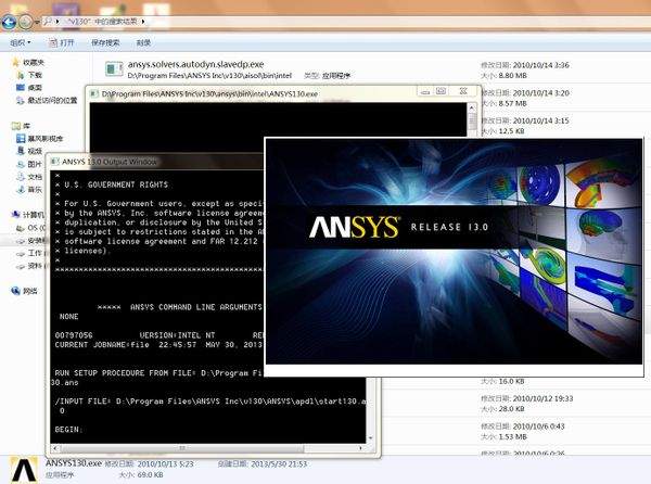 ansys 13 全部按照百度文库上的教程一步一步安装完毕,中间没有任何问题。但是安装完后开始菜单和桌面都没有快捷方式,找到安装目录下的ansys.exe执行后,只弹出了两个DOS窗口(其中一个是ansys的output窗口,如图中左边两个窗口,右边那个图形界面过了一会后就消失了),无法进入图形界面,退出再执行后就提示ANSYS130_DIR is not set.请问各位大神这是什么原因?怎么解决?