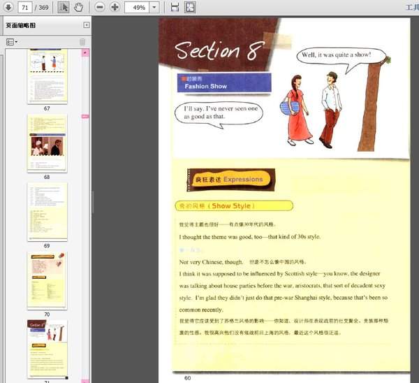 内容提要 围绕与现代生活息息相关的话题,分为“衣”、“食”、“住”、“行”、“购”五章,每章又分为若干个谈话主题,每个主题下设日常用语一点通、经典句型、疯狂表达、疯狂对话、经典影像观摩、词句荟萃和疯狂链接。《疯狂英语900句(附光盘入门篇)》句子举一反三,对话贴近生活,电影紧跟话题,词句荟萃涵盖核心词汇,疯狂链接网罗扩展表达。内容丰富完整,方便查阅,是一本不可多得的口语宝典。 1.jpg 2.jpg 目录: Chapter 1 农Clothes Section 1 询问建议 Section 2 款式风格 Section 3 质地、材料(丝绸、亚麻等) Section 4 品牌 Section 5 搭配 Section 6洗涤方式 Section 7 打扮 Section 8 时装秀 Chapter 2 食Food Section 1 在家就餐 Section 2 外出就餐 Section 3 西餐 Section 4 中餐 Section 5 快餐 Section 6 酒水饮料 Section 7 风味小吃 Section 8 饮食偏好 Chapter 3 住House Section 1 宾馆 Section 2 租房 Section 3 买房 Section 4 搬家 Section 5 房屋设施 Section 6 装修 Section 7 维修 Section 8 物业管理 Chapter 4 行Transportation Section 1 指路 Section 2 公交地铁 Section 3 出租车 Section 4 私家车 Section 5 火车 Section 6 飞扔 Section 7 轮船 Section 8 出入海关 Chapter 5 购shopping Section 1 招呼顾客 Section 2 询问、回应 Section 3 商场大减价 Section 4 讨价还价 Section 5 付款 Section 6 退换 Section 7 试穿 Section 8 质保[ 来自小组 皇家神龙教 ] [ Last edited by AnnF on 2013-5-31 at 16:38 ] |