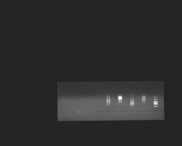 是啊。。。新手 ,胶浓度是1.5%的,上样量是6微升。从右边依次是marker,然后剩下四条带分别是用两种不同引物扩增自己用试剂盒提取的质粒的产物,第一条和第三条是同一种引物,第二条和第四条是同一种引物。感觉是不是拖尾有点严重。。而且从左边数的第二条带怎么会有那么亮的一条。。 ![]() PCR程序是:94度 5min 94度 45s 59度 45s 72度 45s 29循环 72度 10min 反应体系应该问题不大吧,我按照PCR试剂盒的说明书的量加的 试剂 终浓度 50 µl体系 Sterilized ddH2O - 20.8 µl 10×PCR Buffer 1× 5 µl dNTP Mix 0.2 mmol/L 5 µl Primer 1 1 µmol/L x 5 µl Primer 2 1 µmol/L x 5 µl Taq DNA Polymerase 1 U 0.2 µl MgCl2 4 mmol/L 8 µl 模板 10 pg-1 µg 1 µl 多谢啊!! |