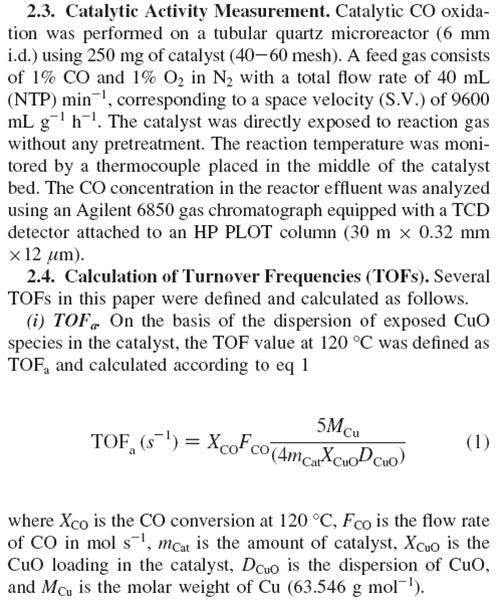 这个是用分散度来计算TOF的, (CO转化率 * CO流量) / 参与反应的活性CuO 我觉得你没算清楚的是公式的后半部分 --参与反应的活性CuO. X(CuO)是一个百分数,催化剂中CuO的量。 D(CuO) = 活性CuO / 总的CuO;再乘以m(cat)* X(CuO),这个时候就是活性CuO的量,单位和m(cat)一样,应该是 g(克) D(CuO)* m(cat)* X(CuO)这个再除以 M(CuO)就是活性CuO的摩尔数,mol。 这里你注意看了 文章作者除以的是M(Cu)而不是M(CuO),所以有个5/4. Cu分子量是64,O的分子量是16。 这么写起来,你看明白了吧。或者你可以跟文章作者交流一下。 |