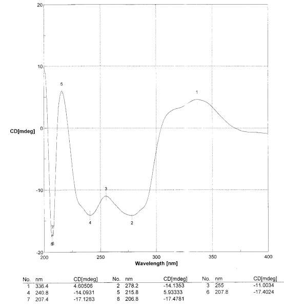 本人小硕一枚,做天然药物化学的课题,临近毕业,一不小心分离到一个新的化合物,可看不懂CD谱,确定不了绝对构型,所以向大侠们求教啊,很急很急,后天答辩的!!! 这里先行谢谢啦! ![]() AL-2-2-CD.jpg |