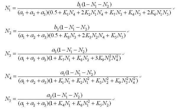 什么是文本格式的方程代码啊?方程组就是下面的N1至N5的多项式组成的方程组,图片应该能看见啊。期中a1、a2、a3、b1、b2、K1至K9都是已知数(上面已经给出)。我不怎么会发帖。写错了。。。十分感谢帮忙编写程序!!您是希望复制方程组方便?可是有个平方项打不上去。。