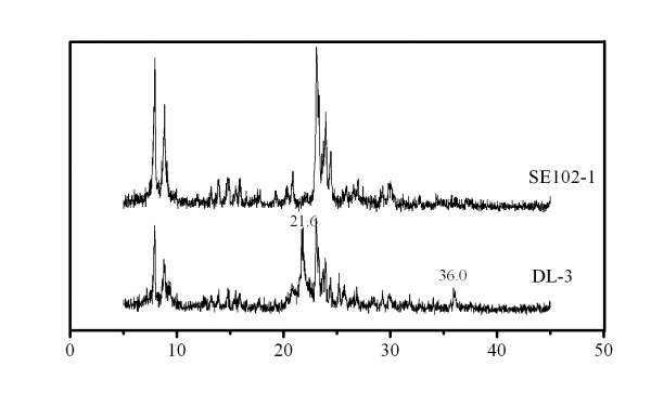 上面一幅图是正确的ZSM-5的XRD,下面一幅图有杂相出现,峰位置在21.6和36.0左右,这是什么杂相呢?一般合成ZSM-5时为什么出现这种杂相?我是用的水玻璃正丁胺在180度下晶化3天合成的。
