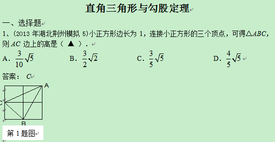 本内容由用户自主发布,如果其内容涉及到知识产权问题,其责任在于用户本人,如对版权有异议,请联系邮箱:xiaomuchong@tal.com - 附件 1 : 2013年5月全国各地名校最新初三试卷分类汇编:直角三角形与勾股定理.doc