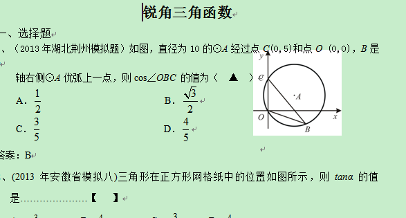 2013年5月全国各地名校最新初三试卷分类汇编:锐角三角函数.doc [ Last edited by zhweijun88 on 2013-6-8 at 23:17 ] |