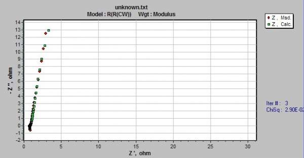我最近在学交流阻抗,看了一些资料,但是还是感觉没上手。我用的是ZSimpwin软件,测试条件是三电极体系,2 mol/L氢氧化钾,饱和甘汞电极为参比电极,工作电极为四氧化三钴,大家看一下我的图,我拟合的感觉误差太大了,总是找不到合适的等效电路(我用的是R(R(CW))这个电路),我把原始数据传上来了,请大家帮帮我呀。马上要讲组会了,很着急啊。万分感谢! CC-12.jpg CC-1.jpg |