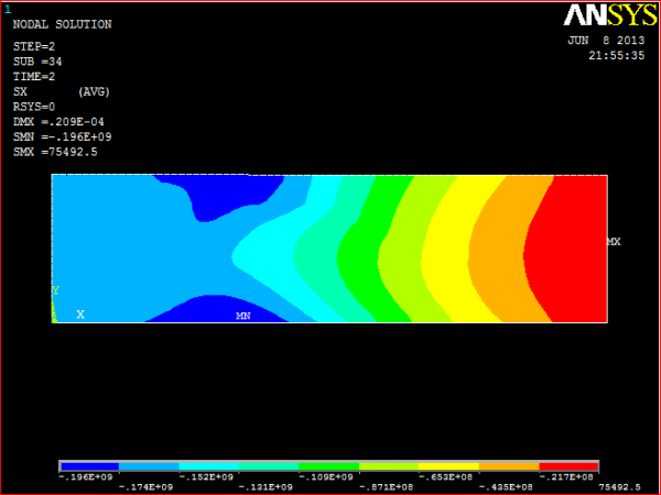 你这是定义了双线性塑性材料,不再是弹性材料了。 其中两个参数: Yield Stress - 屈服应力; Tang Mod - 切线模量。 是否进入屈服是用 Mises 应力来判断的,你可以看一下 Mises 应力的值是否超过了屈服应力值。你的第一个图中的最多应力值小于第二个图中的最大值,估计是进入了屈服,但不多。 |