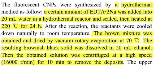目前我按一些文献制备CNPs,为什么做不出来呢?老在旋蒸后出不来要的东西。用EDTA.2Na做的 谁有高招 实验步骤在下面: J8]G}$TQV1G{{IO5D[F7RY0.jpg ZD(}EHB`I]HE8C$26(]HWSR.jpg |