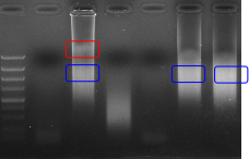 图片1是反向pcr结果,然后将红框和蓝框的带进行胶回收(胶回收试剂盒),回收的产物跑胶结果如图片2.请问为啥都在胶孔处,跑不动啊,我回收的是啥玩意啊?谢谢。