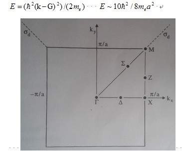 图中给出了正方形晶格的布里渊区的平面图,其中具有高对称性的一些点已被标出。请画出当k沿所示直线通过路径F-M-X-F时,自由电子能带的能量?直到?的草图。