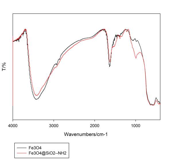 做了磁性四氧化三铁颗粒,外面包覆硅壳,并上了氨基,去做了一下红外分析,结果如图所示,大家帮我看下硅壳和氨基有没有上上去啊,红外图不会分析,谢谢大家