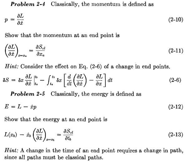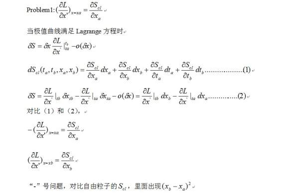 费曼写的作用量个路径积分里的两个小问题。第一个问题,我直接从拉格朗日方程入手,对最小L积分,然后取x=xa,但是想想,既然xa可以,xb不就也可以。所以想法不对,提示说从2-6出发。第二个问题的提示没看懂是什么意思,恳请理解的同学指点。 |