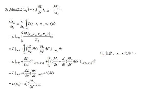 记号看不懂,建议楼主下次把记号说明附带上去。为此特地去下了本费曼的书,幸好楼主给出书名。不过是中文的,Y的,中文版公式2-13还打印错的,顿时蛋碎一地。 我是这么推到的。同时还有些问题。 首先几个概念,(楼主应该把这几个概念打出来的,不然看不懂啊) (1)x(t)满足x(ta)=xa;x(tb)=xb; (2)作用量S(t,x,x'),Scl是x满足Lagrange方程对应的S值,此时S(ta,tb,xa,xb)=L(ta,tb,xa,xb,t)在ta到tb上的积分; 第一问:(2-11)从右到左推到 注意到S(ta,tb,xa,xb)和S(t,x,x')的关系,x是体分布的,xa是端点分布。detla(x)【代表x的变分】和d(xa)【代表x的微分】是从属关系,因此依据提示利用(2-6)S的一阶变分式。 以xa为变量为例:S(ta,tb,xa,xb)应应该包含(2-6)的2项,第一项是关于d(xa)的线性项,系数就是我们要求的;第一项是关于detla(x)的线性积分式,次项是d(xa)的“高阶无穷小”,注意到x满足Lagrange方程,x的微小扰动对于方程也是微小的。因此求偏微分就是所求的结果。 第二问:(2-13)从右到左推到,关键在第二部分,使用带变量的积分式的求导公式。 注意到S(ta,tb,xa,xb)和L(ta,tb,xa,xb,t)(注意含有时间t)的关系,对S(ta,tb,xa,xb)关于tb求导分为两部分; 第一部分,关于积分域求导,即L(ta,tb,xa,xb,t),当t=tb的值。应该就是L(xb); 第二部分,注意到tb与x(t)中的t的地位恒同。为什么?求极值曲线时,我们其实再求解两点边值问题,然后你懂的。因此第二部分又包含两部分, integral {(DL/Dx)* detla(x‘) + (DL/Dx’)*detla(x‘‘)},分部积分,就得到所要的结果。得注意下xb的导数其实就是d/dx {detla(x)} 在tb处的取值。 推到的时候会发现个问题,(朗道说过“物理中所谓的数学都是自欺欺人的”这句话吗?? )经典Newton方程求解的是初值问题,给出坐标及速度,解的唯一性一般是抗抗的; 最小作用原理,给出两点边值问题,给出2个坐标;Y的,对于后则在数学上解可能不唯一,可能无解,可能有无穷个解。因此对应的Scl是不是不唯一了。 |