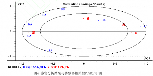 谢谢你。但是那两个圈圈分别表示示50%和100%的方差贡献率,能自己画吗?以下是文献中对这幅图的解释分析:图是感官属性与传感器的相关性载荷图,图中的两个椭圆,分别表示50%和100%的方差贡献率。传感器ZA、BB、BA、GA、HA、CA和感官属性涩、和甜味位于两个椭圆之间,说明该模型可以对这些变量具有更好的解释能力。由图可知,传感器ZZ与涩、苦味的相关性较好,传感器JB与酸味相关性较强,而传感器HA、CA与甜味的相关性较好。