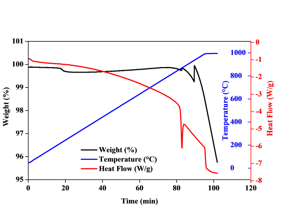 上图中TG曲线在900度左右突然有个振荡,这是怎么回事呢?样品为PbO,N2。