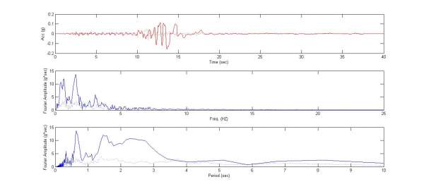 第一幅图是时程曲线,纵轴是加速速度值,第二幅图是傅里叶谱,纵轴是傅里叶变换后的加速度值