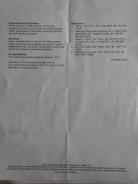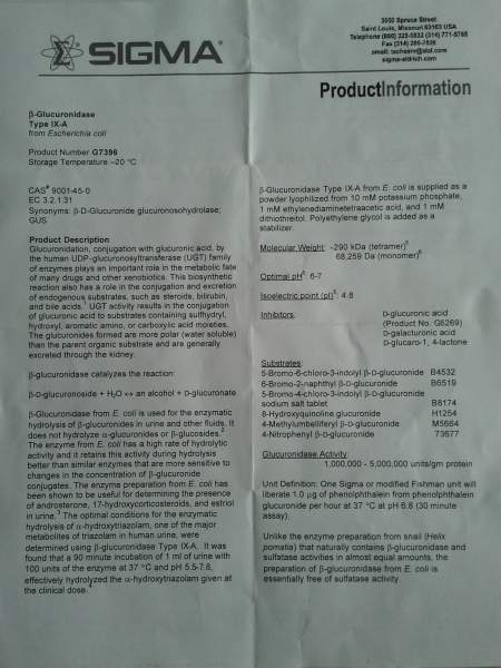 之前在网上搜beta-葡萄糖醛酸苷酶怎么用,溶液怎么配,储备液怎么保存,说法有很多,文献写得也是各式各样的。 最近弄到份sigma的说明书,里面写得挺全的,还有参考文献,大家用的时候可以参考一下。 IMG_20130609_18203800.jpg IMG_20130609_18200400.jpg |