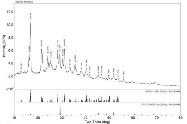 给位大神,以下是硼酸锌的XRD谱图,本人不懂这方面的,求各位大神帮忙解析一下。一般解析从哪方面入手,为什么会有多个曲线,分别代表什么意思,如果要计算硼含量该怎么计算。谢谢大家了! @_R_X8H9)O3_%]`HLDDG4W6.jpg |