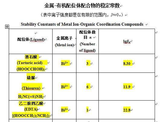 水相中合成纳米铋的过程中,为了铋盐水解,能否先将铋离子和络合剂络合后,再参加反应? 请问,如何判断铋离子是否与络合剂络合上了? 下面是能与铋离子络合的物质的信息,我现在用柠檬酸与铋离子络合,摩尔量比1:1加料后,溶液澄清透明,这样能否判断是络合上了呢?用没有什么方法判断呢? 360截图20130620165202841.jpg |