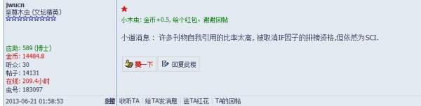 简单说就是漏了而已,8000+的杂志漏几个不是很正常么,2011年Nanoscale不就漏过么,后来还不是补上了,所以根本不用担心。 关于这点我早就在很早的一个帖子里给过编辑的群信 http://muchong.com/bbs/viewthread.php?tid=6033207&authorid=387686 Dear all, As you may know, the 2012 Journal Citation Reports which contain the journal impact factors and other metrics was released yesterday. Unfortunately, Journal of Materials Chemistry has been omitted from the list and we are contacting Thomson Reuters to correct this. We were told when we were looking into the journal division that the parent journal would continue to receive an impact factor until the 2014 JCR (to be released in 2015). I will let you know as soon as I have an update. Best, Liz Dr Liz Dunn MRSC Editor |Soft Matter|Materials Horizons| Managing Editor |Journal of Materials Chemistry A, B and C|Polymer Chemistry|Biomaterials Science| 没有内部消息也就算了,想想IF的定义是什么,也应该知道到底今年该不该有。JMC在分刊时早就明确说了IF直到2015出最后一个,同时ABC出第一个。 本来没想发帖,但是看到还是很多小白啊,不懂可以不说,怎么能传谣呢,看看下面的帖子吧。 http://muchong.com/bbs/viewthread.php?tid=6034029&pid=5#pid5 http://muchong.com/bbs/viewthread.php?tid=6033762&fpage=1 http://muchong.com/bbs/viewthread.php?tid=6034029 其中有一条让哥震惊了,毫无节操可言啊。http://muchong.com/bbs/viewthread.php?tid=6033762&fpage=1 8楼 小道消息 : 许多刊物自我引用的比率太高, 被取消IF因子的排榜资格,但依然为SCI. 2013-06-21 01:58:53 JMC.jpg [ Last edited by mouse0601 on 2013-6-21 at 17:47 ] |